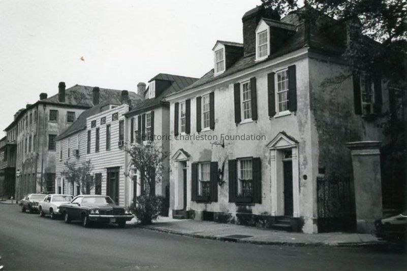 B&W photograph of the view south on Church Street from the Alexander Peronneau Tenements (141 Church and 143-145 Church Street) to the Dock Street Theater (135 Church Street). Front (east) elevation. Cars parked on the street in front of the buildings.Collection