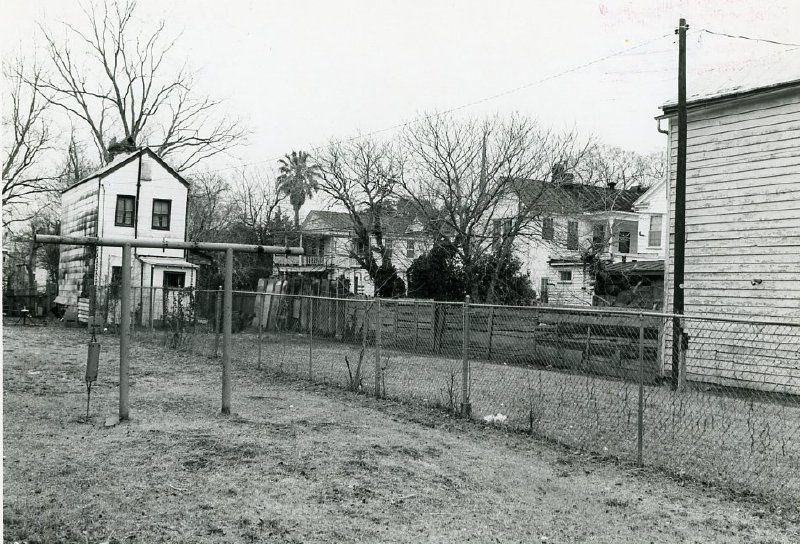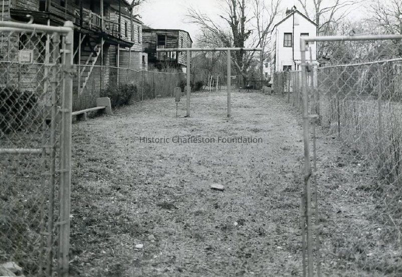 Two B&W photographs showing the rear views of 144 Coming and 146 Coming Street and the yard in between.