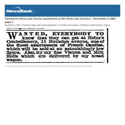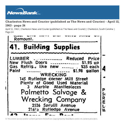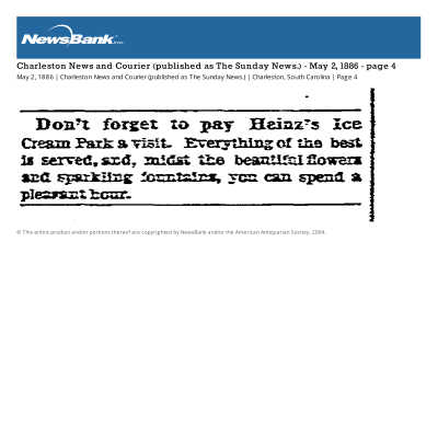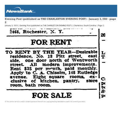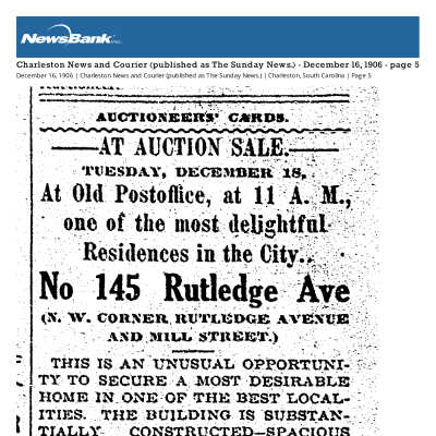 There's no history of this property in HCF's Archives. What is known is that by 1880, Frederick Heinz, a baker, was living at 11 Rutledge Avenue, located at the northwest corner of Rutledge Avenue and Mill Street. By 1902, the address became 145 Rutledge. Sanborn Maps don't indicate the presence of the small building next to the three-story house but that appears to be the location of the ice cream shop, while the family resided next door. An 1886 advertisement announced "Don't forget to pay Heinz's Ice Cream Park a visit. Everything of the best is served, and, midst the beautiful flowers and sparkling fountains, you can spend a pleasant hour." In 1906, 145 Rutledge was offered for sale as "an unusual opportunity to secure a most desirable home in one of the best localities," touting it as "substantially constructed-spacious halls, fine, large, airy rooms with high ceilings, large piazzas…outbuildings for servants quarters; stable and carriage house." Around 1910, "apartment for rent" advertisements begin to appear in the newspapers and it appears that rental apartments remained available until the early 1960s. By 1963, the property was demolished as this advertisement indicates: "WRECKING 145 Rutledge corner of Mill Street. Plenty of good used material and 3 marble mantelpieces." Today, MUSC's Rutledge Tower stands on the site. ("America's News-Historical and Current," "Heritage Quest-Family History Books and Directories," and "Fire Insurance Maps Online [Sanborn Maps], each accessed via the Charleston County Public Library website.)Collection