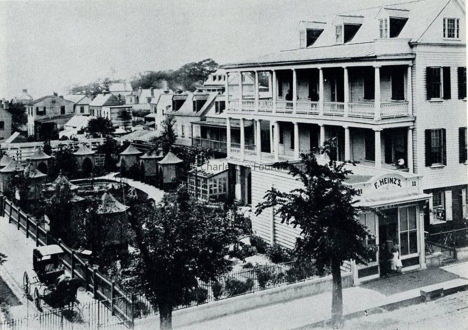 Reprint of a photograph of the F. Heinz's house and ice cream parlor that was located at the northwest corner of Rutledge Avenue and Mill Street (originally 11 Rutledge Avenue, later 145 Rutledge). View of the three-story house, small ice cream shop with sign projecting from the corner of the building, and the large lot with outbuildings and garden features. A horse-drawn carriage approaches Rutledge from Mill Street.