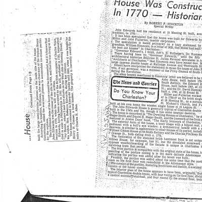 File contains FOHG house histories (ca. 1978, 2004); other narrative history (unattributed, undated); building history from Architectural Guide to Charleston (by Simons & Thomas); newspaper articles (including DYKYC 1932, 1977, and 1981); HCF correspondence related to proposed repairs (1983, 1984, 1998); sketch of the front facade (undated, unattributed); photocopy of photo of front facade (unattributed, 1978?).Collection