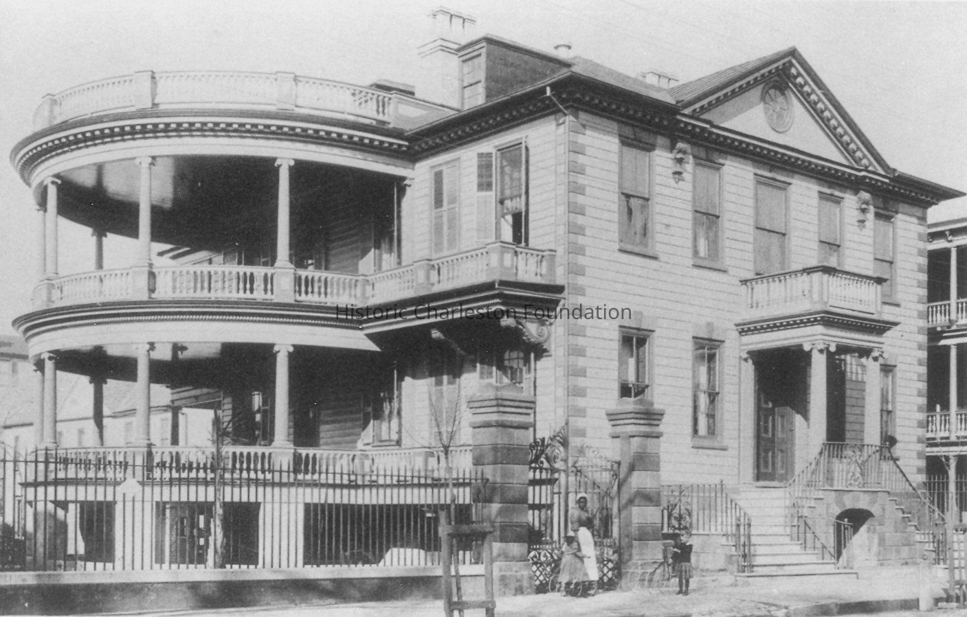 Constructed ca. 1770; additions late-19th century. This structure, built by John Edwards, is typical of Charleston double houses of the 1760s and 1770s. It features four rooms on the first floor divided by a central entrance stair hall, and four rooms on the second floor. The house is unusual, however, in rusticated wood front: cypress siding cut to stonework, a practice also employed by George Washington in his house at Mount Vernon. Records indicate that a number of other Charleston houses featured this detailing. Edwards was prominent in local politics during the American Revolution, serving with "Dictator" John Rutledge's privy council. He was later imprisoned by the British and exiled to St. Augustine for his role in the Revolution. The semicircular piazza on the south side of the house was added at the beginning of the 20th century. (Poston, Buildings of Charleston.)