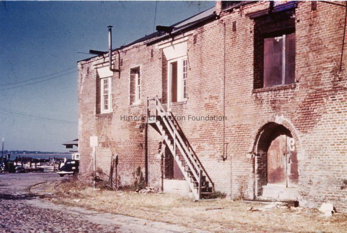 Color photograph of 15 North Adger's Wharf, presumably before any rehabilitation work was done. Cooper River can be seen in the background.Collection