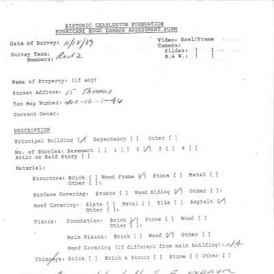 File contains newspaper articles (DYKYC 1968 & 1978); building history (Samuel G. Stoney, undated); 1886 Earthquake damage assessment; Hurricane Hugo damage assessment; captioned newspaper photo (Focus on Historic Houses, 1979); photo from This is Charleston ("Valuable").Collection