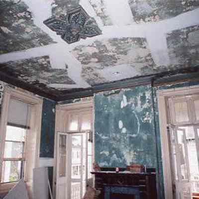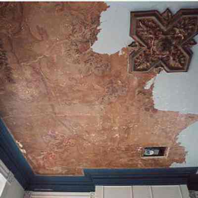 f-g: Ceiling with wallpaper and ceiling ornament.