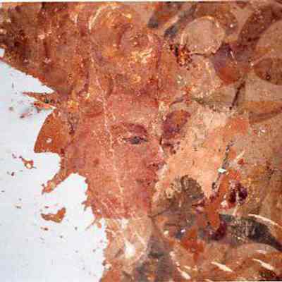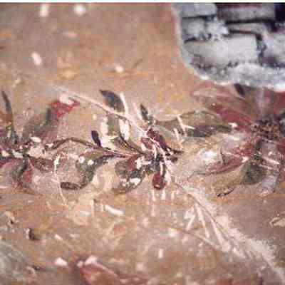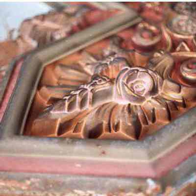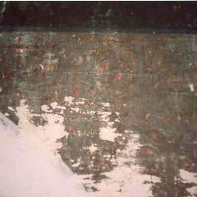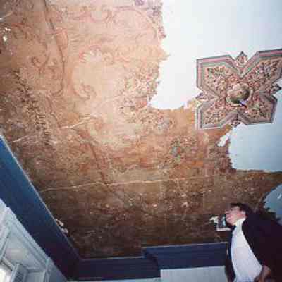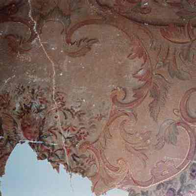 d-e: Details of fragments of ceiling wallpaper; possibly the same ceiling as in photo C.