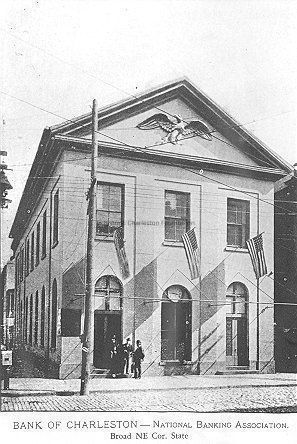 Constructed 1817; addition 1850. This 2-story stucco building was erected to house the Second Bank of the United States, but after that institution's closure in 1834, it was acquired by the Bank of Charleston. The simple Neoclassical facade is accented by a pediment with its original carved and gilded oak eagle. On its interior the main banking room retains its elaborate Rococo Revival plaster cornice. The north wing, designed by Edward C. Jones in 1850, still houses the building's original boardroom, a splendid space with Italianate and Rococo Revival detailing, including marbleized pilasters supporting an arcaded cove and ceiling. The present bank complex also incorporates several other important buildings including 2 State Street, 14 Broad Street, built in 1799 but twice remodeled, and 12 Broad Street, a circa 1783 structure with a granite, pilastered facade in the Greek Revival style added in 1839.