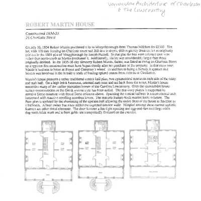 Constructed 1834-35; renovated 1996. Robert Martin, a wealthy trader in upland cotton, purchased this lot from planter Thomas Milliken in 1834 for $2500. The lot, now 100 feet wide along Charlotte Street and 200 feet deep, differs from the original 1801 plat of Wraggborough. The 1835-36 City Directory lists Robert Martin, a factor, living on Charlotte Street, suggesting that construction had begun after his purchase of the property. Martin's house has a traditional central hall plan with 2 symmetrical rooms on each side of the entry and staircase hall. Set on a high brick basement, this house resembles many of the earlier plantation houses of the Carolina lowcountry with its piazza supported by massive Doric columns on the ground story and fluted Doric columns above. Paired dependencies at the rear form a domestic courtyard protected by a high brick wall from East Bay Street. The whole complex has been renovated as a law office.