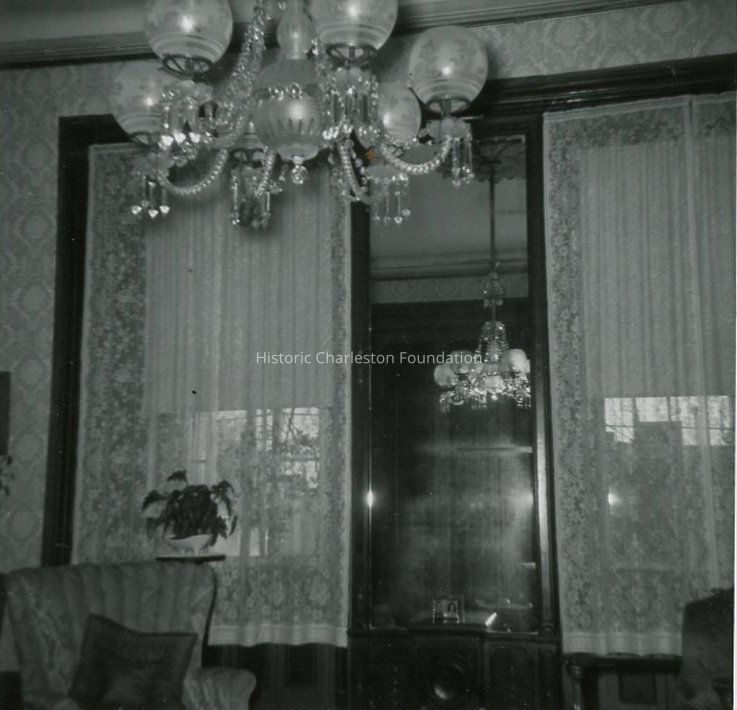 b: View of windows in an interior room. Chandelier in top foreground. Captioned on back: "Front windows with built-in mirror."