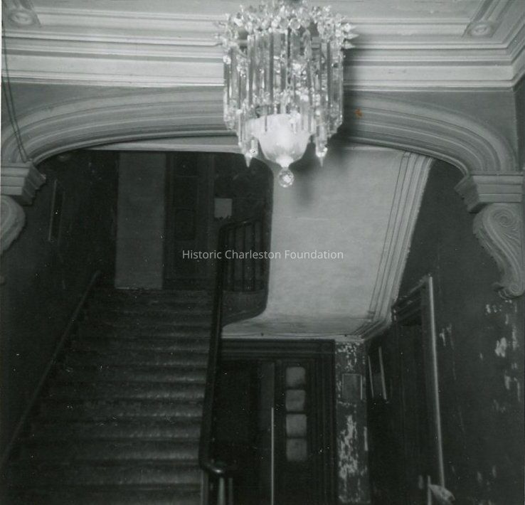 c: View of staircase through an arch. Chandelier in top foreground. Captioned on back: "Gold arch and stairway."