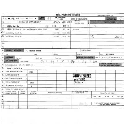 File contains 1973 SC Architectural Inventory entry; information about 20th century occupants from The Old Codgers Charleston Address Book; photocopies of Sanborn Maps (1902, 1929, 1944, 1951, 1955); Charleston County property record card.Collection