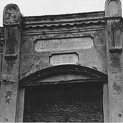 b-c: Detail of top of building, "Young America 1866" carved into the wall. (Photo C not scanned.)Collection