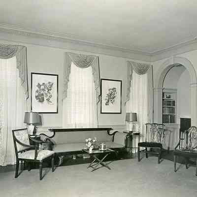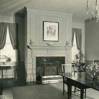 c: Interior room. Captioned on back: "Miss Elliott, some times referred to as 'plantress,' and member of an extensive Low Country family, seems to have built this 'single' house in the decade following the Revolution. It is characteristically quite simple with and handsome within, decorated with a modified use of the Adam style. Having been restored only last year by Mr. and Mrs. James M. Hagood, it is now open for the first time."