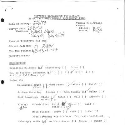 File contains graduate student report (William P. Hamilton, 2006) on the history of the building/property, which includes historical and chain-of-title research, maps, photos, and other supporting documentation; Rosen and Associates (engineers) Hurricane Hugo damage report (1989); 1886 Earthquake Damage Assessment; Hurricane Hugo Damage Assessment Survey (pdf).