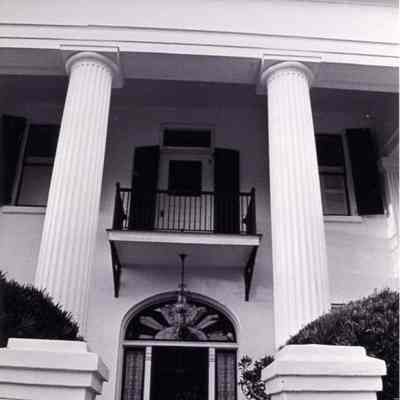 b: View of entry, doorway, and second story balcony from between two columns. Photograph by Carroll Ann Bowers.Collection