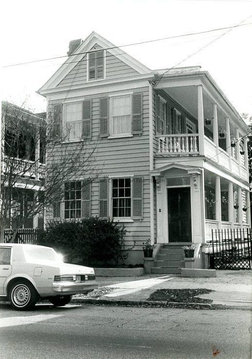 B&W photograph of 161 Broad Street (Berend Jutjen House), street (front) elevation, view of northwest corner of the building (piazzas).Collection