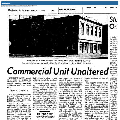 The property on which this building stands was acquired by Samuel Prioleau in 1817. It is a 2-story, flat-roofed antebellum building that served as the ship reservation office for the Clyde Steamship Co.