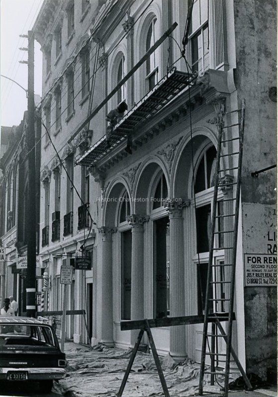 B&W photograph of 17 Broad Street (South Carolina Loan and Trust Co. Building) undergoing exterior repairs. Street (front) elevation.