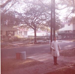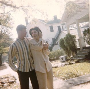 d: Man and woman (owner of photos and his wife) taken in front of 17 Elmwood Avenue (not seen), showing some porch details of the neighboring bungalow at 15 Elmwood Avenue and the rear of the corner house at 560 Huger Street, with a rear staircase in place (because the owners, Condons, used it as a rental).