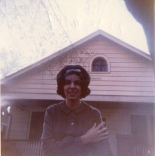 b: Woman on the brick walkway of 17 Elmwood Avenue, showing the front porch details, with simple brick posts on which square, framed columns were constructed, and a simple rail. (The woman is the wife of the owner of the photos.)