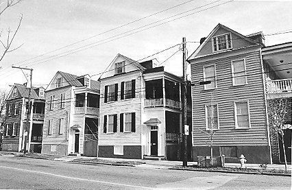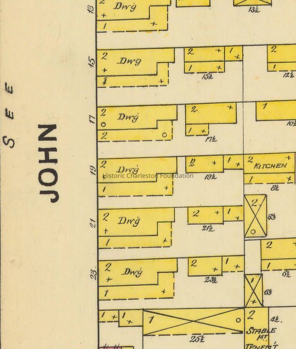 Constructed 1852-56. The wealthy builder William Henry Houston constructed five nearly identical 2½ story, frame Charleston single houses at 17-25 John Street. A resident at this time on nearby Charlotte Street, Houston rented the dwellings to a succession of clerks, clothiers, and craftsmen. Although all of the buildings retain two-story piazzas and closed gable ends with tripartite windows, each property reflects differing approaches to renovation. (Poston, Buildings of Charleston.)