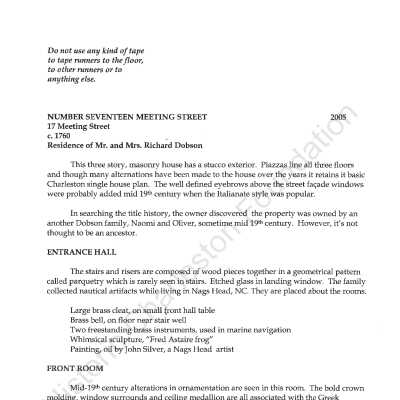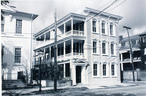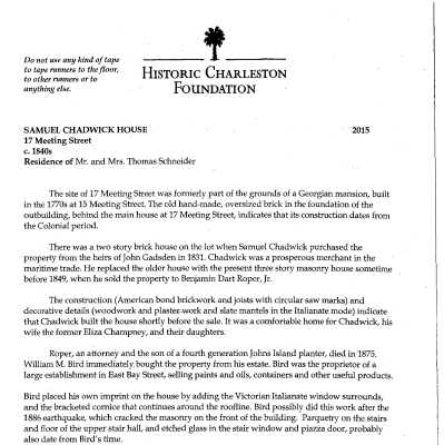 Constructed ca. 1840s. The site of 17 Meeting Street was formerly part of the grounds of a Georgian mansion, built in the 1770s at 15 Meeting Street. The old hand-made, oversized brick in the foundation of the outbuilding, behind the main house at 17 Meeting Street, indicates that its construction dates from the Colonial period. There was a two story brick house on the lot when Samuel Chadwick purchased the property from the heirs of John Gadsden in 1831. Chadwick was a prosperous merchant in the maritime trade. He replaced the older house with the present three story masonry house sometime before 1849, when he sold the property to Benjamin Dart Roper, Jr. (FOHG tour script, HCF, 2015).