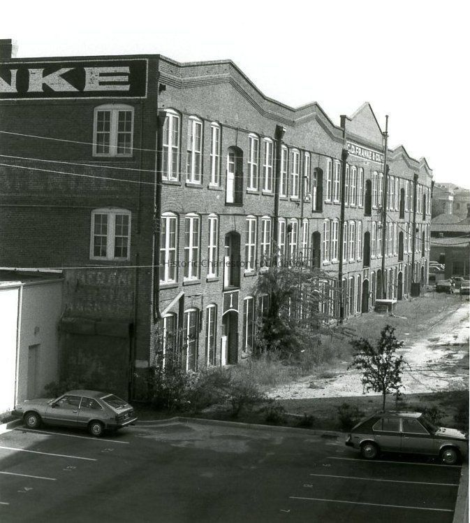 Two B&W photographs of 171 Church Street (C.D. Franke Building), southwest corner, taken from what seems to be a slightly elevated view. The vacant south area, later paved with bricks, can be seen, along with the parking lot in rear of neighborning building.Collection