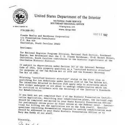 FIles contain documentation of the easement on the property including Amendments (various years) to the Master Deed,* related correspondence and Confirmation of Understanding; lists of building ownership; Part I certification (National Register) and designation letter; annual inspection reports, requests for alterations, and correspondence related to the management of the property; excerpt from Vernacular Architecture of Charleston; captioned photo of nearby groundbreaking, warehouse in the background; C.D.Franke Co. letterhead and check, both with illustrations of Jahnz Block (warehouse building) and Franke Building at 170-172 Meeting Street; plat; photocopy proposed site plan (poor-quality copy) and captioned newspaper photograph of proposed elevation (Ehni Architects, 1983); Rosen and Associates inspection report (1997, 2003).