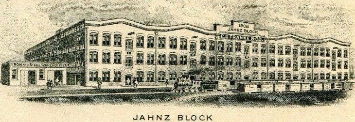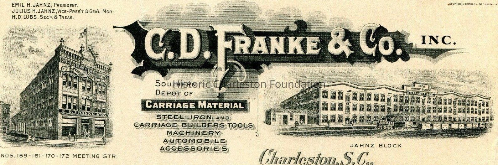 Constructed ca. 1909; rehabilitated 1984. The Franke Warehouse, at the northwest corner of Market and Church Streets, is an important example of early-20th century industrial architecture. It was constructed as a manufacturing and storage building for a carriage company founded in 1859 by C.D. Franke, a Prussian immigrant. His carriages and wagons were marketed throughout the Southeast. By the 1870s the company had also become a supplier for carriage parts, iron products, and hardware. By the early-1900s Franke (Jahnz) Company was manufacturing auto parts in this building. It closed in 1981, was rehabilitated, and now serves as an office complex. It is one of only a few surviving examples of the industrial nature of the Market Street area prior to World War II. (Poston, Buildings of Charleston.)