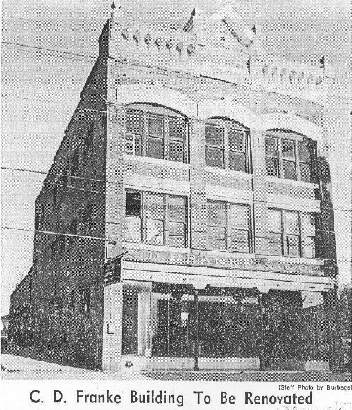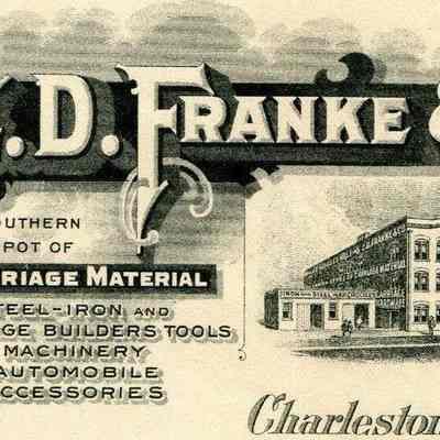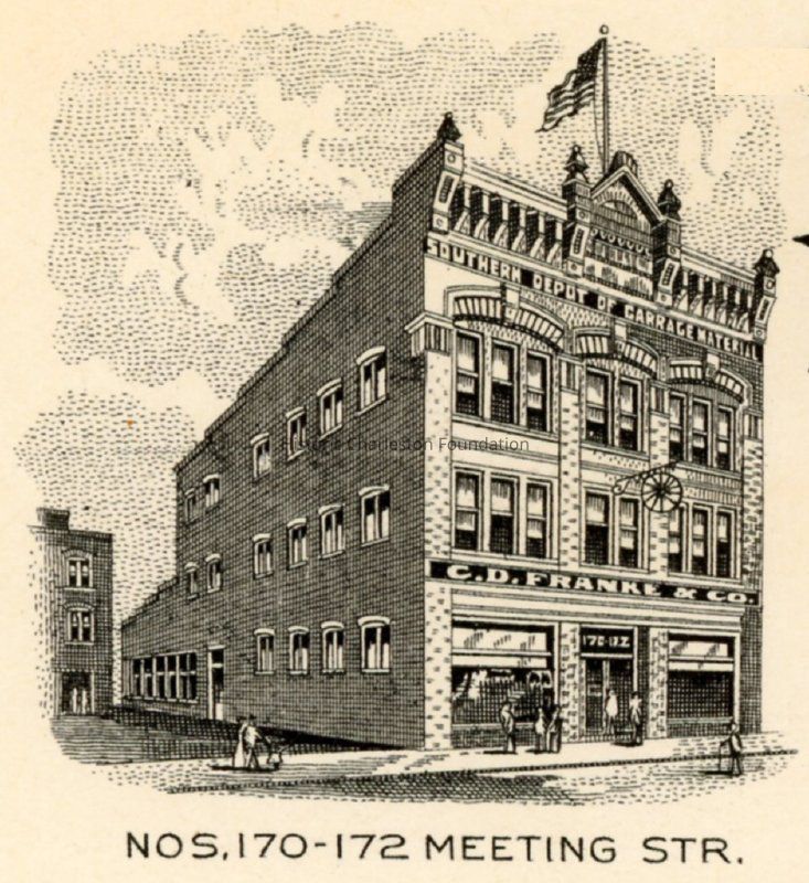 Constructed 1908; rehabilitated 1974. John D. Newcomer, architect. The C.D. Franke Company, carriage makers and formerly suppliers of gun carriages, bought this block extending to Church Street in 1905. Then controlled by Emil Jahnz, the company built its large factory at 171 Church Street and this three story, pressed brick building as its showroom and office by 1908. The window surrounds, flat on the second story and segmentally arched on the third, harmonize with the pressed-metal pedimented entablature giving the Franke name and dates. The entablature and parapet were heavily damaged in Hurricane Hugo in 1989 but fully restored afterward. (Poston, Buildings of Charleston.)