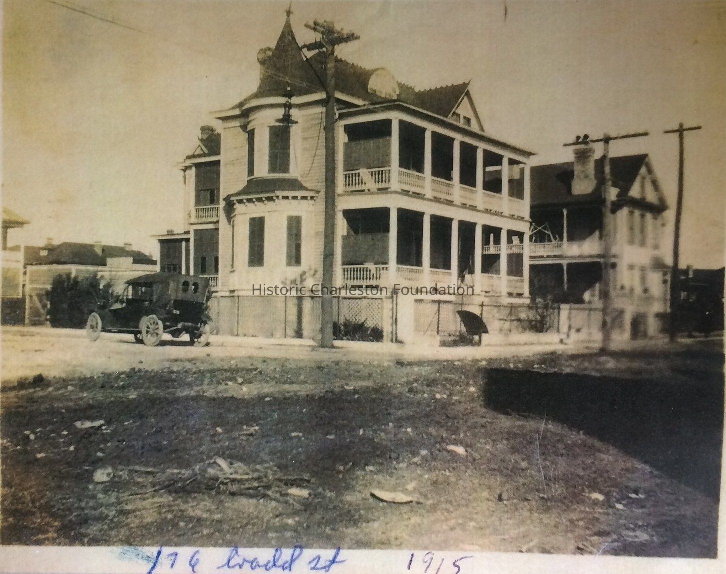 Photograph (scan) of 176 Tradd Street in 1915. Oblique of the original house on the property, showing the south (front) and west elevations. Also shows 174 Tradd, the street corner (Tradd and Colonial Streets), and a car parked on Colonial Street. The house was demolished in the early 1970s and replaced by a townhouse.Collection