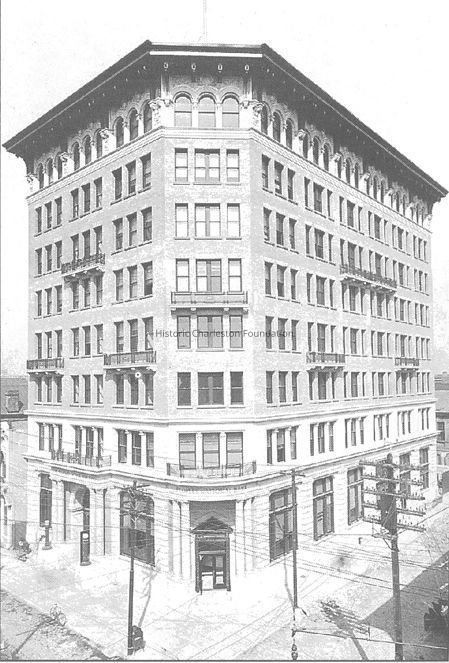 Constructed, 1910-11. Victor Frohling, architect. Mayor R. Goodwyn Rhett, while president of the People's Bank, spearheaded the construction of The People's Building as Charleston's first skyscraper. It stands on the site of a late 18th-century brick double tenement, an indication of the city's early-20th century progress. Critics then, as now, debated the effect of the 8-story structure on the skyline of the original city. Designed by the New York architect Victor Frohling, the largely yellow brick building has granite rustication on the ground and mezzanine stories and terra cotta ornamentation, now painted with a metallic finish, at the top floor, although a later owner removed the surmounting entablature. The columned portico and shuttered ground-story window openings, the People's Building retains a Charleston flavor, while the rest of the structure hints at the contemporary national influences. The marble lions flanking the entry, brought from an estate in Massachusetts in the 1950s, are considered landmarks in their own right and were saved from removal by the city's Board of Architectural Review in the 1990s. (Poston, Buildings of Charleston.)