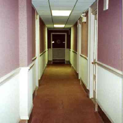 k-p: Unidentified floor, showing the hallway and doors to various offices.