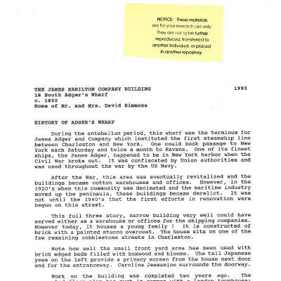 File contains: FOHG house history (1993); newspaper article "Extensive Brick Warehouse Being Remodeled to Provide Homes on South Adger's Wharf (3/31/1948); history of Adger's Wharf from Information for Guides of Historic Charleston (1984) and from City of Charleston Tour Guide Training Manual (2011).Collection