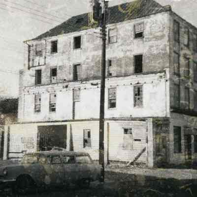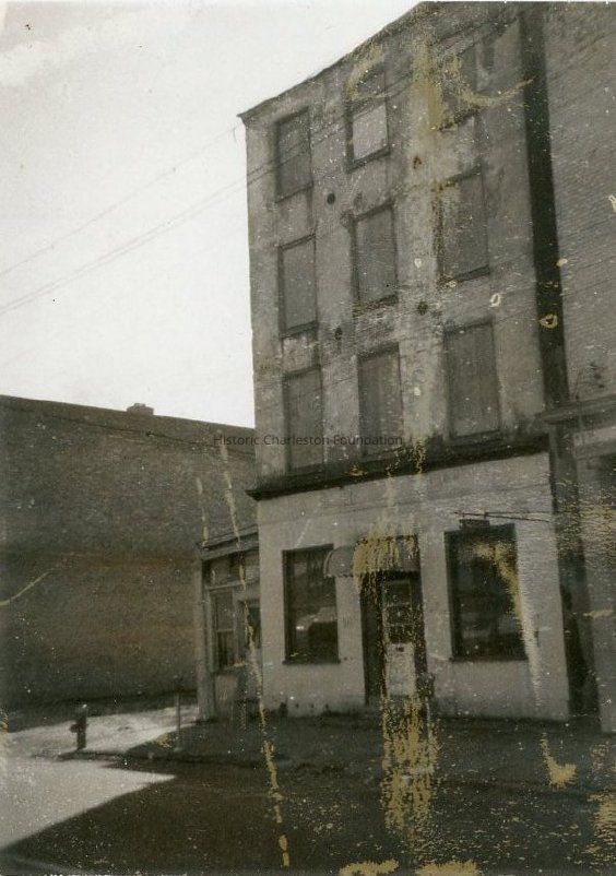 b: South elevation showing the southeast corner of the building. At right is the edge of the neighboring building, 183 East Bay. Written on back: "Nothing of value inside but lovely stair and bannisters (sic) from 2nd floor to 4th - palladian window - all other wood work gone."