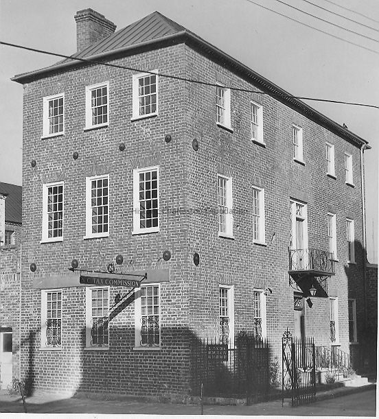 B&W photograph of 184 East Bay Street (Gaillard-Barker Building), front (east) elevation and showing the southeast corner of building. Sign for "S.C. Tax Commission" projects from building.Collection