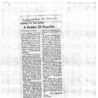 Constructed ca. 1800. Daniel Cannon, sawmill owner and builder and developer of Cannonborough, gave the site of this house in trust for his niece, Sarah Peronneau Webb, in 1798. The house, possibly constructed by Cannon himself, is believed to date from