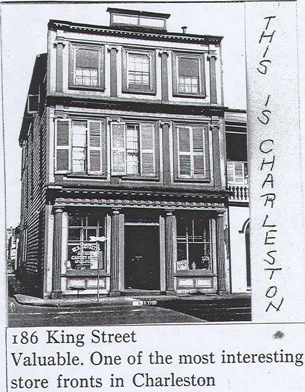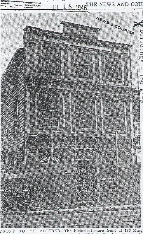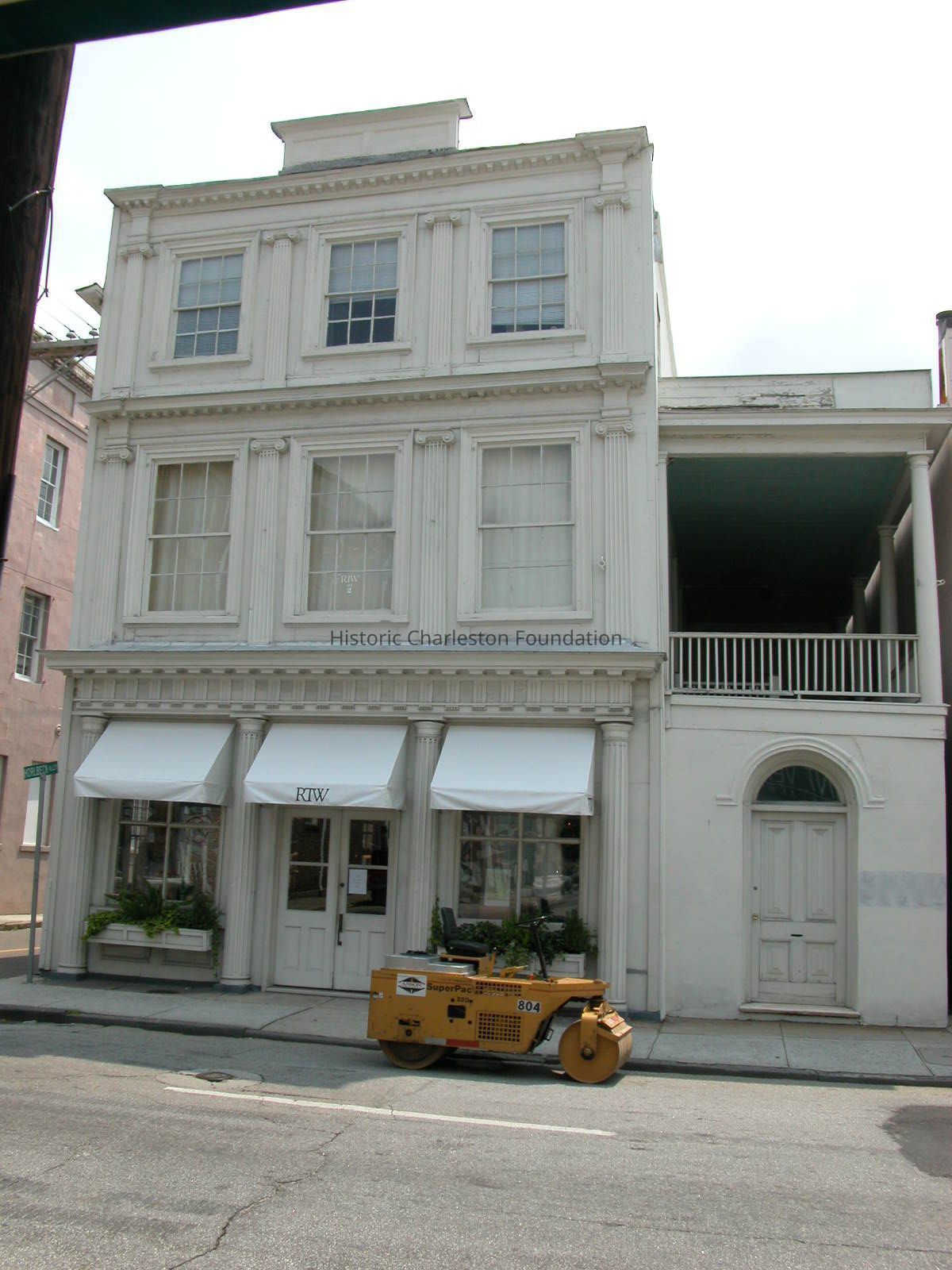 Constructed before 1788; restored 1978. The restoration of this decorative wooden corner structure was hailed by preservationists in the 1970s as a triumph of commercial restoration. The pre-1800 structure was built by a German physician, Dr. George Hahnbaum, one of the founders of the Medical Society of South Carolina. Hahnbaum's building with beaded wood siding on the north wall and a stuccoed south wall was re-fronted in the early-19th century, probably by John Rudolph Switzer, a saddler who used the building until his death in 1811. Switzer may have lived here, but he also constructed a residence at 6 Montagu Street in 1803. Andrew Moffett, a dry goods dealer, bought the site in 1835. Moffett built the fine brick house at 328 East Bay Street as his residence. The outstanding feature of the building is its front facade with a ground story, classical entablature with a triglyph frieze supported by 4 engaged, fluted columns surmounted by 2 levels ornamented with Ionic pilasters and topped by a modillioned parapet. Frances Edmunds, then executive director of Historic Charleston Foundation, saved the first-floor columns when the ground story was demolished in an insensitive 1940s conversion of the building to a tavern. In the 1978 rehabilitation these columns were returned and the building was fully restored.