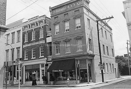 B&W photograph of 188-190 King Street, west (front) elevation. Corner view of 188 King Street, and view of the corner of King Street and Horlbeck Alley at right.