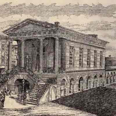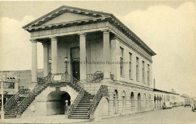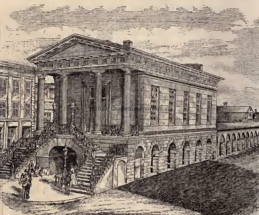 Constructed 1840-41. Edward Brickell White, architect; Andrew Cunningham and John White, contractors. Market Hall and the public market sheds that stretch for several blocks behind the hall are located in the heart of Charleston's 19th century commercial district. The land was conveyed to the city in 1788 by the Revolutionary War General Charles Cotesworth Pinckney and other citizens "to lay out a street from the channel of the Cooper River to Meeting Street 100 feet broad, and in said street to establish a public market or markets for the purpose of vending all sorts of butcher meats, poultry, game, fish, vegetables and provisions." From 1790 to 1806 markets were erected, and in 1837 the cornerstone was laid for a combination masons' hall and market on the site of the present Market Hall. The following year a fire destroyed several blocks of the city including the newly constructed Mason's Hall. The fire prompted the city to enact legislation that discouraged the erection of wooden buildings, and it also inspired the city to contemplate a more permanent market complex. The local architect Edward Brickell White was chosen as the architect for the project. Set on the narrow lot between North and South Market Streets, facing onto busy Meeting Street, Market Hall is located on one of the most conspicuous sites in Charleston. Its temple form is 2 stories in height with a double flight of brownstone steps ascending to a pedimented portico supported by 4 Roman Doric columns. The intended appearance is that of a stone structure, when, in fact, the building is constructed primarily of brick covered with a brownstone stucco. The ground level is heavily rusticated, and the upper story is scored in an ashlar pattern. The cornice, portico, and Doric capitals are red sandstone, while the triglyphs and moldings are cast cement. The bucrania and ram's heads, signifying the presence of a meat market, are made of cast-iron. According to local tradition, the upper meeting room served as a recruitment center as well as a ballroom for benefits of "the cause" during the Civil War. The Palmetto Guard, a distinguished military unit of volunteers, was honored with a farewell reception here before leaving for battle, and its members returned annually to toast their fallen comrades. The last two survivors met in 1917. Since 1899 the United Daughters of the Confederacy have held their functions in the meeting room. Their Confederate Museum has occupied the upper floor for most of the 20th century; however, the upper story was closed after Hurricane Hugo in 1989. Extensive interior and exterior restoration began in 1990s and was completed in 2002.