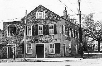 Three B&W photographs of 19 Elizabeth Street (Henry Bulwinkle Grocery), east (front) elevation, taken at slightly different orientations, including the view shown here (corner of Elizabeth Street and Charlotte Street), with the rear of the Mendel Rivers Building visible in the background.Collection