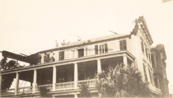 2 - Lamboll Street elevation showing the piazzas and roof damage. Men standing on roof.Photograph Details