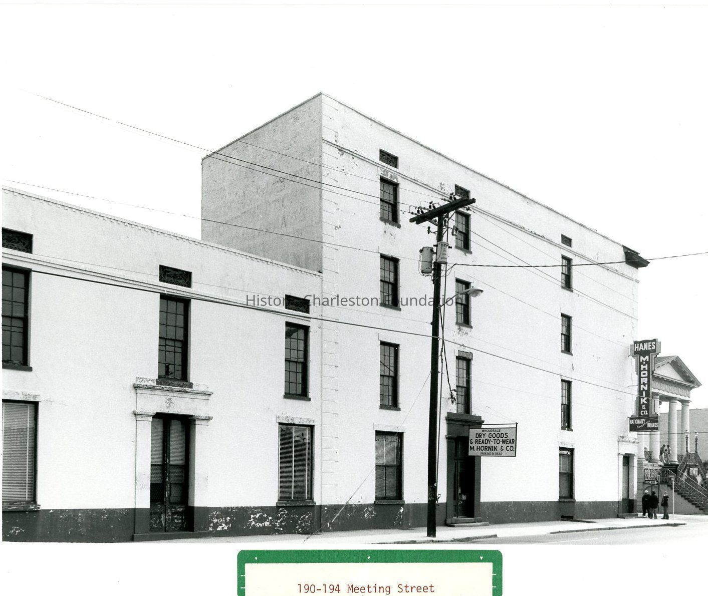 a: 190 Meeting Street (Hornik Dry Goods & Ready-to-Wear / M. Hornik & Co.) and 194 Meeting Street, which had been the Regular Veterans Association Post 479 building. 190 Meeting Street [112 North Market] located at the northeast corner of Meeting and Market Streets. Front of Market Hall at left.