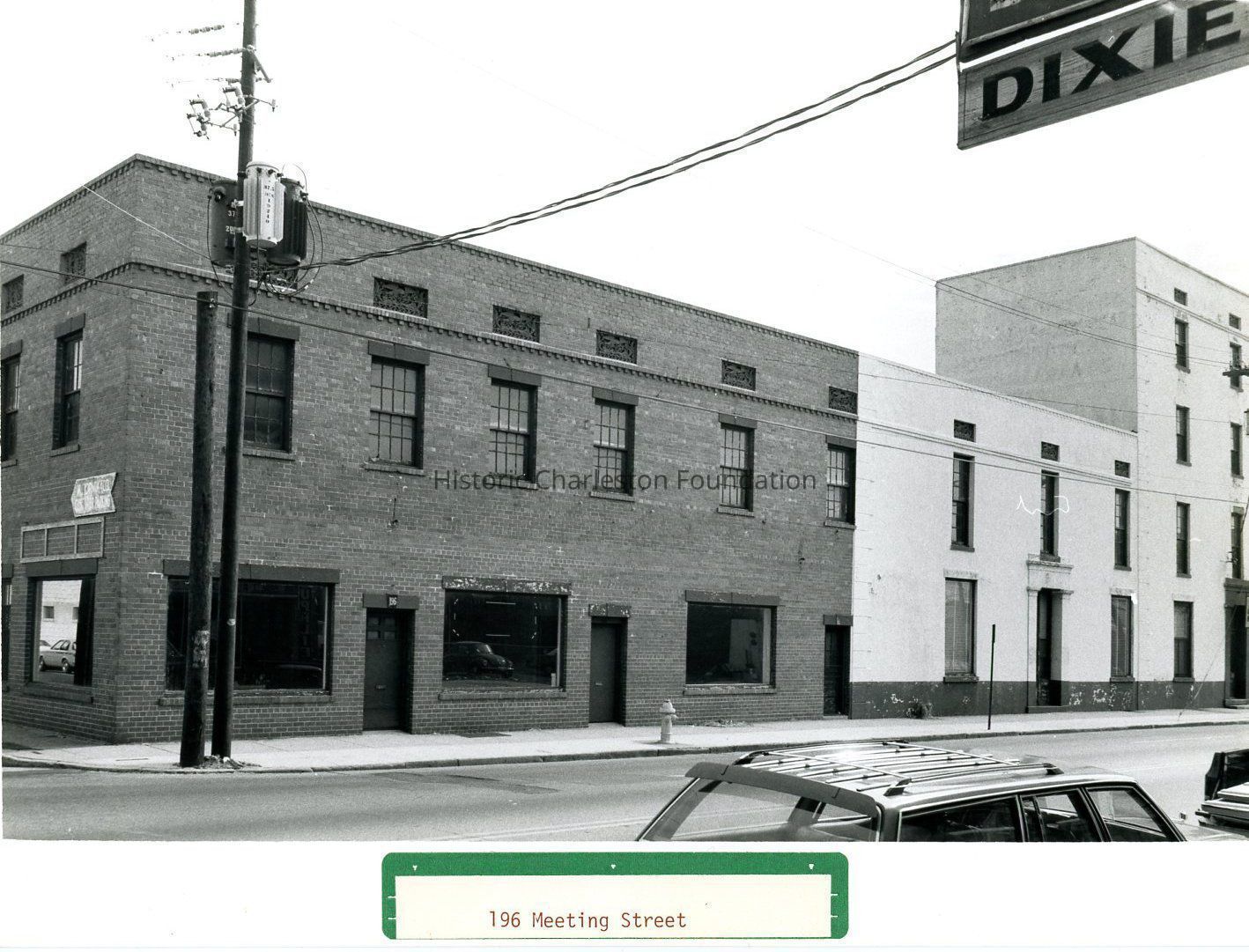 b: 196 Meeting Street, showing the southeast corner of Meeting Street and Hayne Street (left) and 190-194 Meeting (right). Sign for the business across the street in upper left: Dixie [Shoe Company] (211 Meeting).