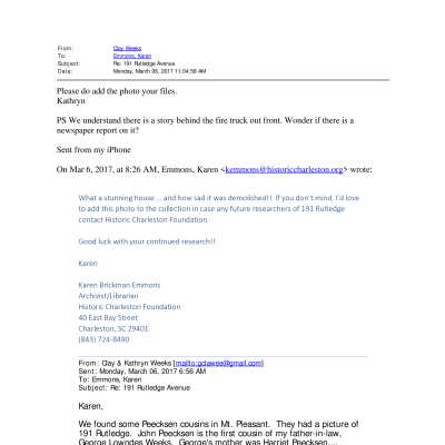 191 Rutledge was a two-story frame Victorian house that was the home of J.N. (John N.) Peecksen, a successful Charleston grocer, in the early 20th century. The house was demolished in 1968 for the construction of the headquarters of the Charleston Baptist Association and Baptist Student Center. It is now the location of the offices of Charleston Cardiology.Collection