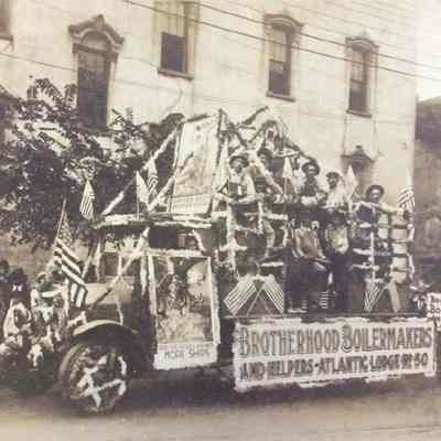 d: Brotherhood Boilermakers and Helpers Atlantic Lodge No. 50 truck and its members parked in front of a building on the parade route.Collection