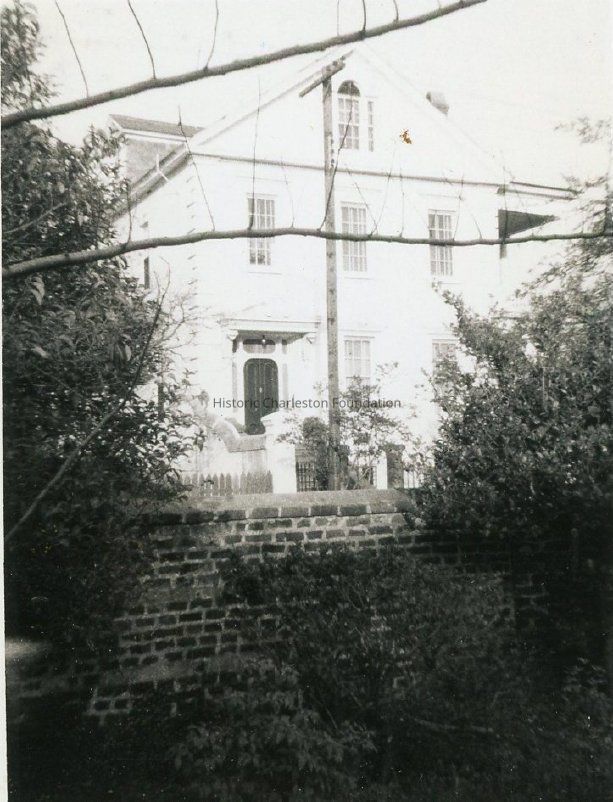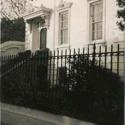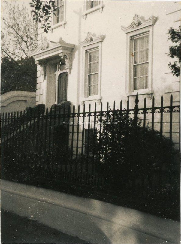 c: Closer view of a portion of the front showing the iron fence, doorway, and first floor windows.Photograph Details