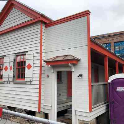Eight color photographs of the Jackson Street Cottages (193-197 Jackson Street), showing the four cottages before and after restoration.