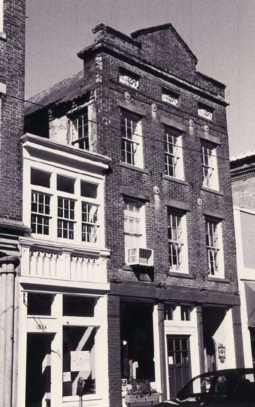 The William building was constructed before 1840 and is an excellent example of early 19th century mixed commercial and residential King Street architecture. This relatively unaltered street facade is very typical of the facades which ranged up and down King Street in the 19th century. Notable about the facade is the quality of brickwork, the brownstone lintels and the cast iron attic grilles, are common elements in the facades of mid-19th commercial and residential facades. Like many King Street properties, the commercial space of 193 King was altered in the late 19th century. It was then that the single house floor plan was lost from the first floor and the two iron columns were inserted to expand the sales space on the first floor. The central stairhall was not removed from the second to third floors where the single house plan survives. (Vernacular Architecture of Charleston and the Lowcountry.)