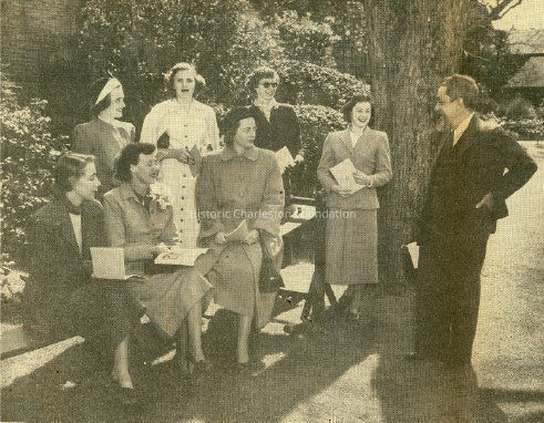 Back row, left to right: Mrs. Edward F. Parker, Mrs. Edwin P. Boggs Jr., Mrs. Edward B. Reeves Jr., and Mrs. Frank Rhett. Seated at front are Mrs. Charles M. Thomas Jr., Mrs. William Haigh, and Mrs. Priestly C. Coker. Standing at right is Samuel Gaillard Stoney.Collection